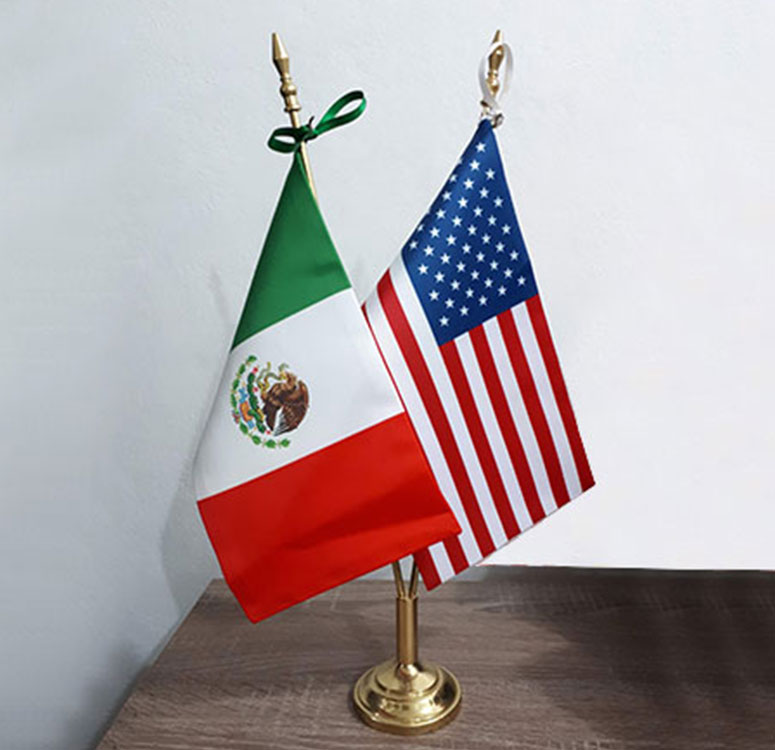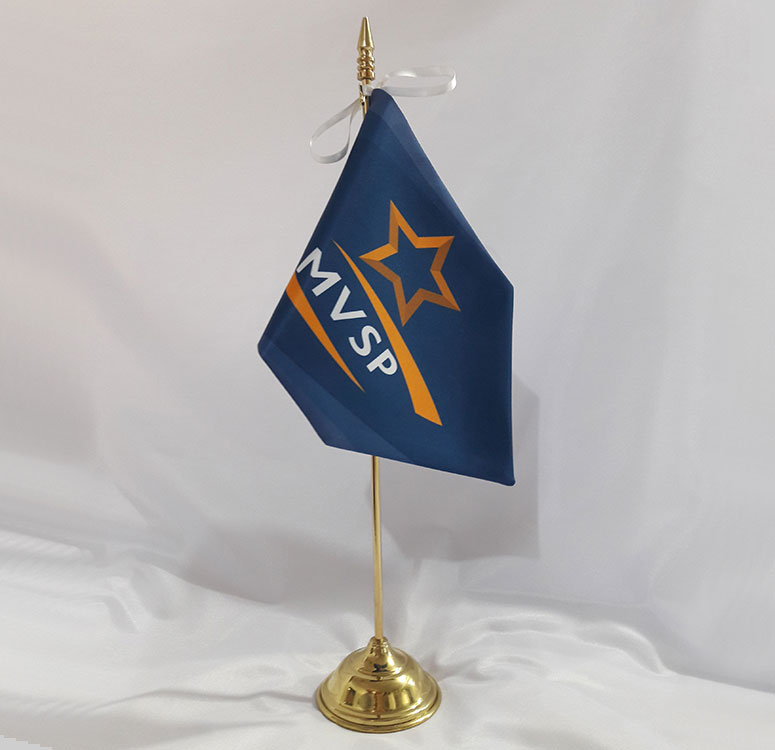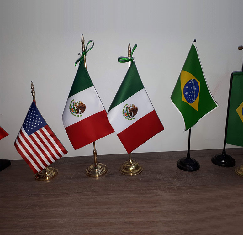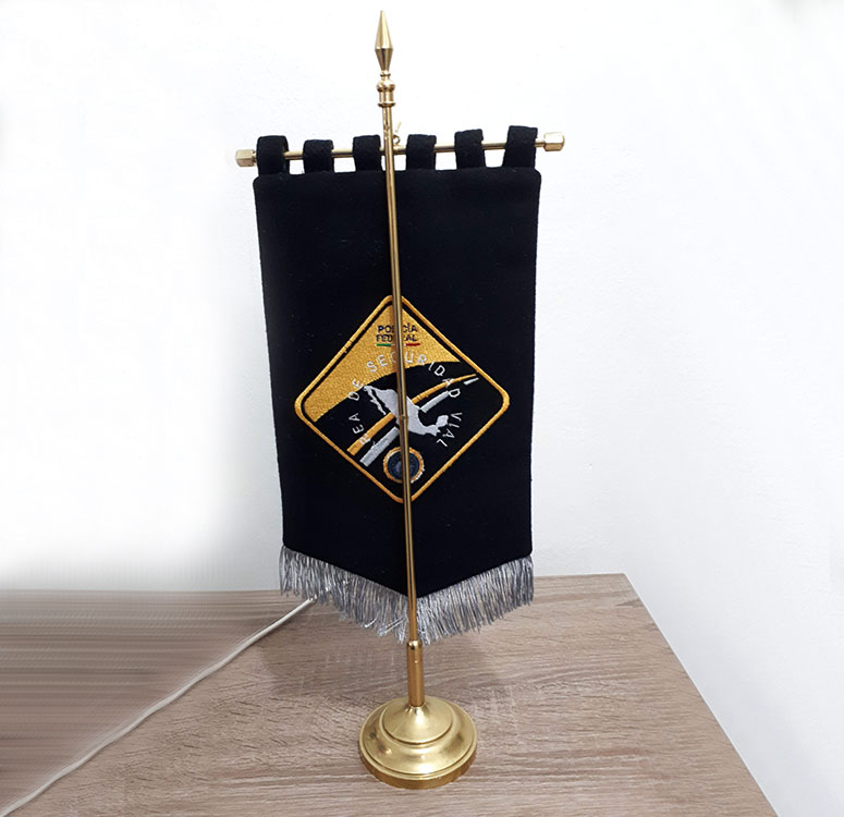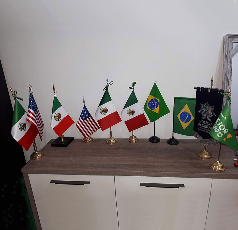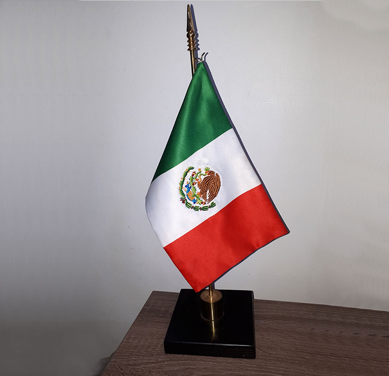 Productos, Banderas de EscritorioEste tipo de banderas son pequeñas, las cuales pueden ser utilizadas como ornamento para hacer lucir su oficina o escritorio mostrando la bandera nacional o con su imagen corporativa. Las medidas de esta bandera son 15 X 25 cm en tela de razo. Se le puede agregar al pedido el asta de la bandera en laton y nicho con los vidrios normales o vicelados. Podemos fabricar banderas economicas en grandes cantidades para grandes eventos, campañas politicas, eventos corporativos, etc. y asi mismo podemos fabricar una sola bandera con telas de seda y bordados con hilos o canutillo de oro para instituciones gubernamentales u oficinas corporativas, con las tecnicas más altas en cuanto a fabricación, y asi mismo, podemos hacer trabajos intermedios con calidad y belleza exepcional.